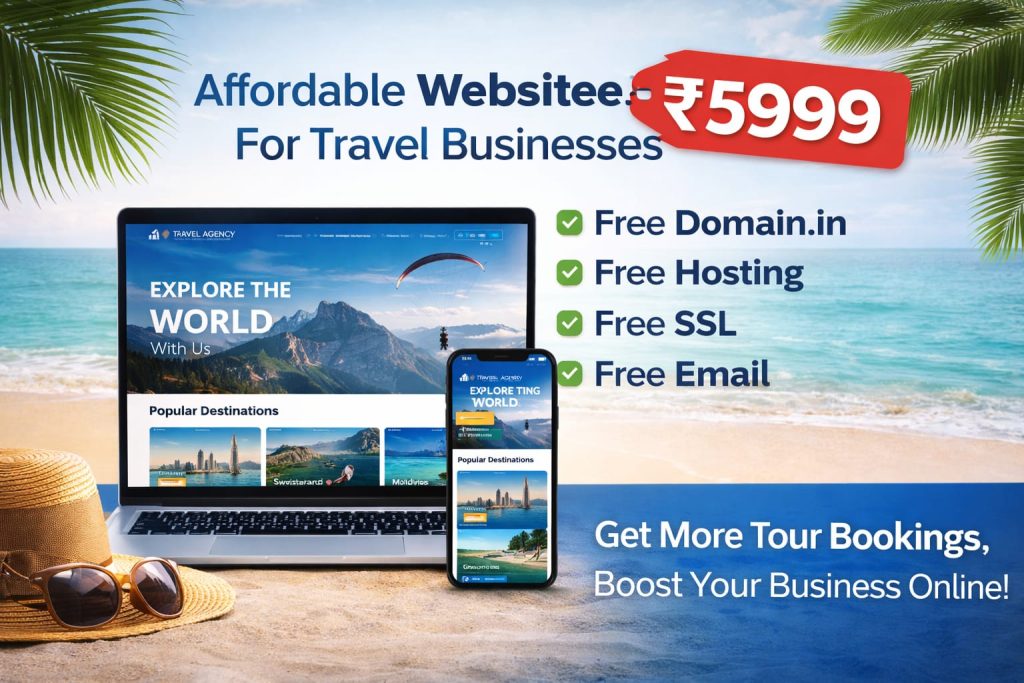 Best website design services in India. Free domain, hosting, SSL, email included. Basic website ₹5,999 | Standard ₹8,999 | E-commerce ₹19,999. Landing page ₹2,999. All India – Travel, Export-Import, Hotel, Real Estate websites. 10% Discount on full payment.